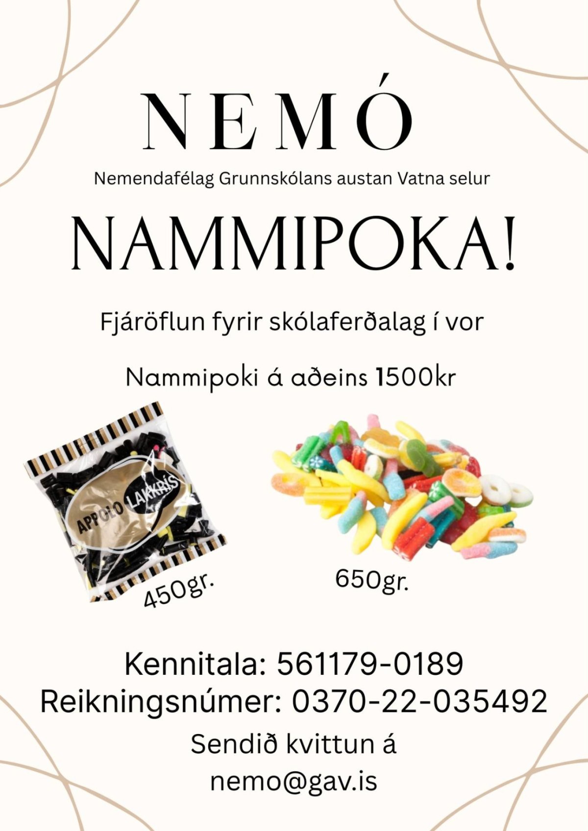 Nú er hafin nammisala hjá krökkunum og hafa þau til sölu hlauppoka og Appolo lakkrís. Nánari upplýsingar á meðfylgjandi mynd.